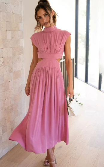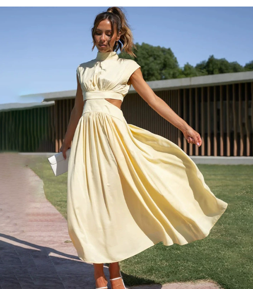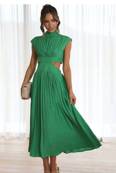 A short black chiffon dress with off-shoulder cutout sleeves, a wrap bodice, and ruffled hem. Playful yet sultry, designed for parties or summer nights out.